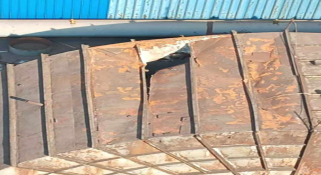 8月27日,檢修員在巡檢時(shí)發(fā)現(xiàn)并上報(bào)了燒結(jié)二號(hào)脫硫增壓風(fēng)機(jī)進(jìn)口煙道頂部約27㎥鋼板出現(xiàn)塌陷,威遠(yuǎn)藍(lán)鼎生產(chǎn)部高度重視,立即將風(fēng)險(xiǎn)隱患上報(bào)燒結(jié)廠(chǎng)部領(lǐng)導(dǎo),協(xié)商時(shí)間處理。當(dāng)天廠(chǎng)部協(xié)商停機(jī)4小時(shí)對(duì)脫落部位進(jìn)行臨時(shí)加固處理。8月28日,廠(chǎng)部利用高溫限電停機(jī)11小時(shí),對(duì)二號(hào)燒結(jié)進(jìn)口煙道頂部脫落位置進(jìn)行全面檢修。